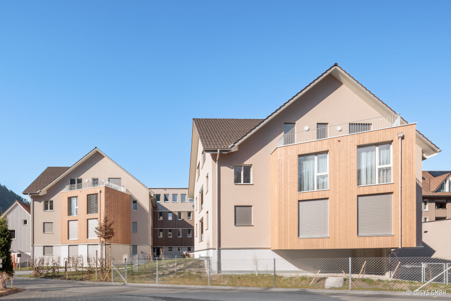 Das Kronen Areal in Nesslau umfasst den Neubau von drei Mehrfamilienhäusern mit insgesamt 16 Mietwohnungen und einem Gewerberaum. Die Gebäude bieten modernen Wohnraum und sind rollstuhlgerecht gestaltet, mit einem gemeinsamen Tiefgaragenbereich für Autos und Fahrräder. Auf den Dächern wird eine Photovoltaikanlage installiert, um nachhaltige Energie für die Bewohner zu erzeugen. Die Umgebung wird zudem mit grünen Pflanzen und einem gemeinsamen Sitzplatz gestaltet, um eine angenehme Wohnatmosphäre zu schaffen.